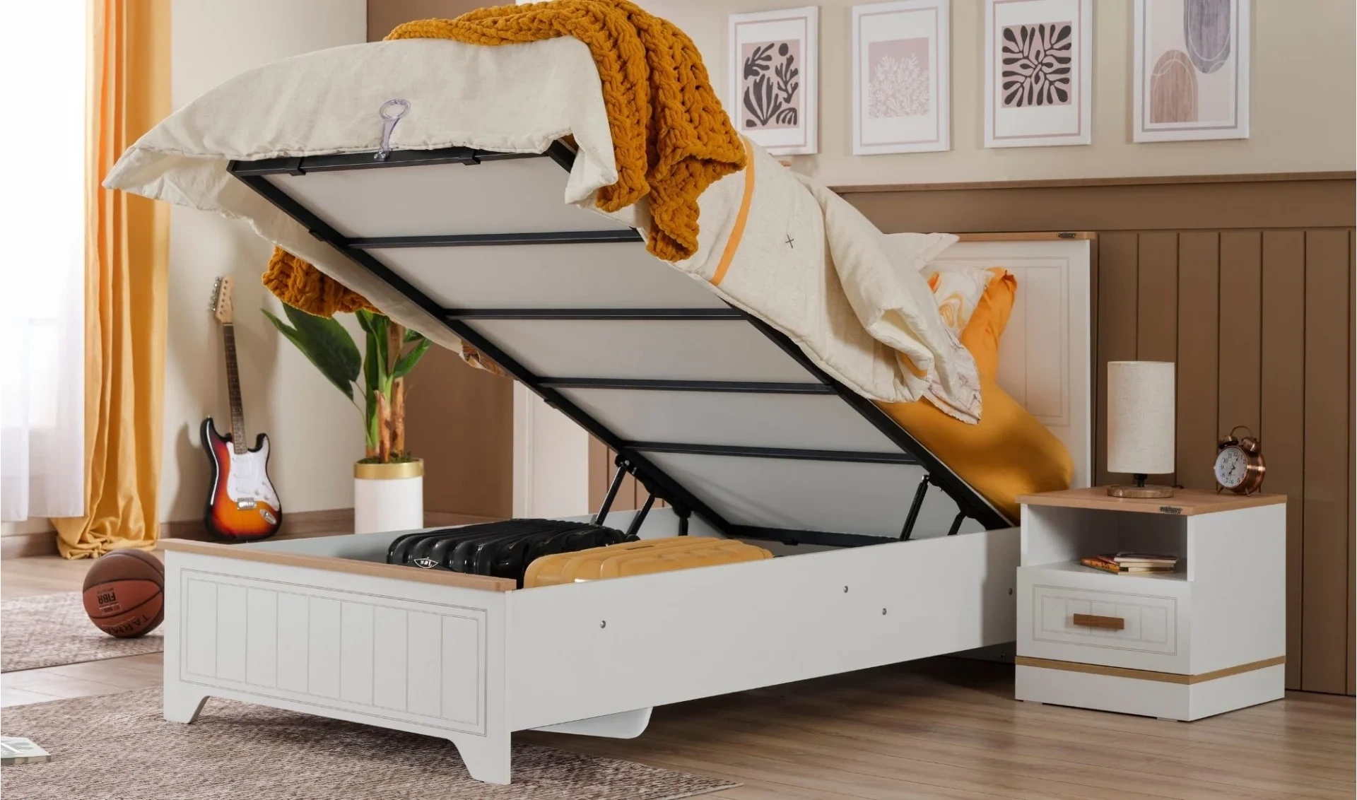 | Karyola | Melamin kaplı yonga levha, metal ızgaralı şaseler esnemez ve dayanıklı malzemelerden üretilmiştir |