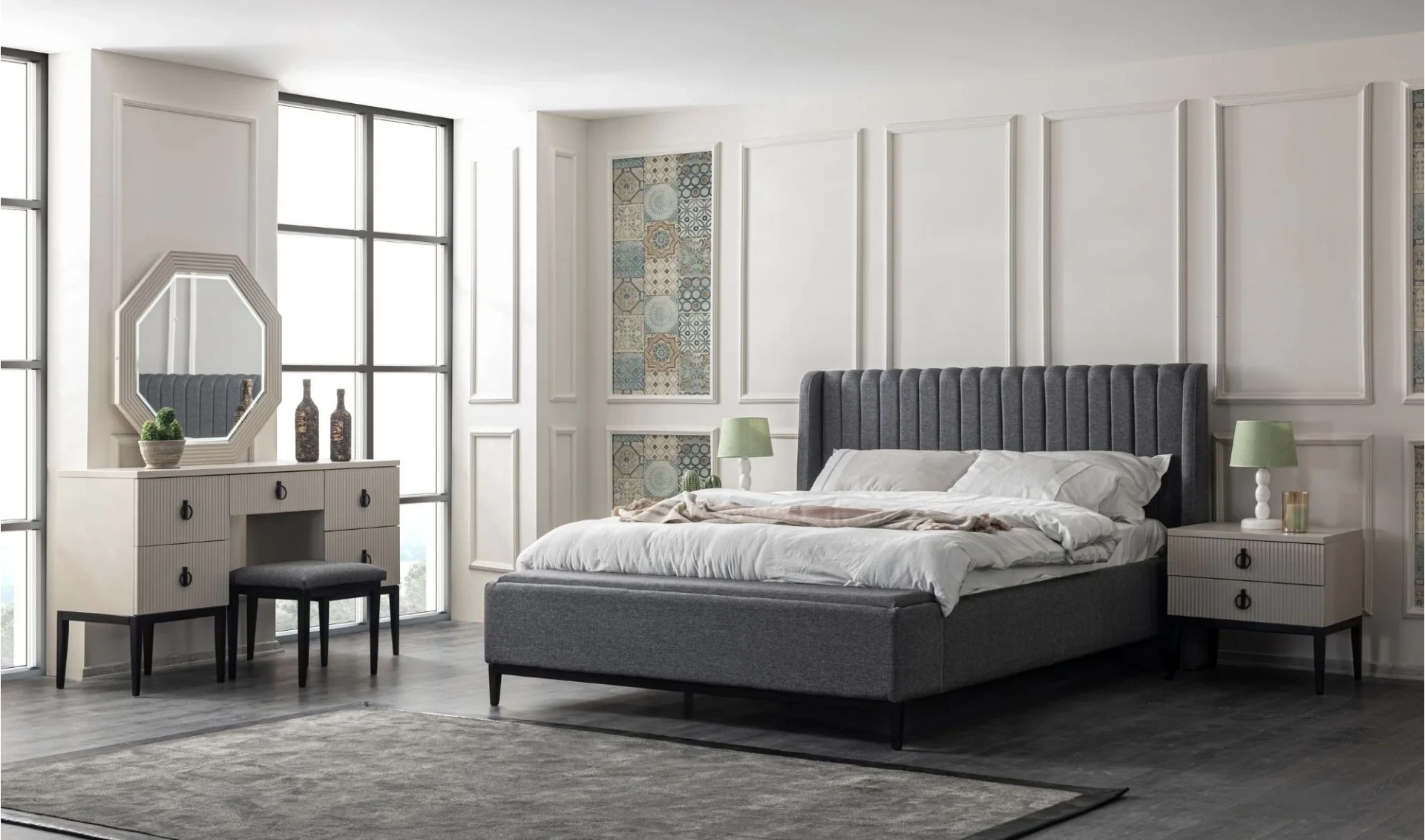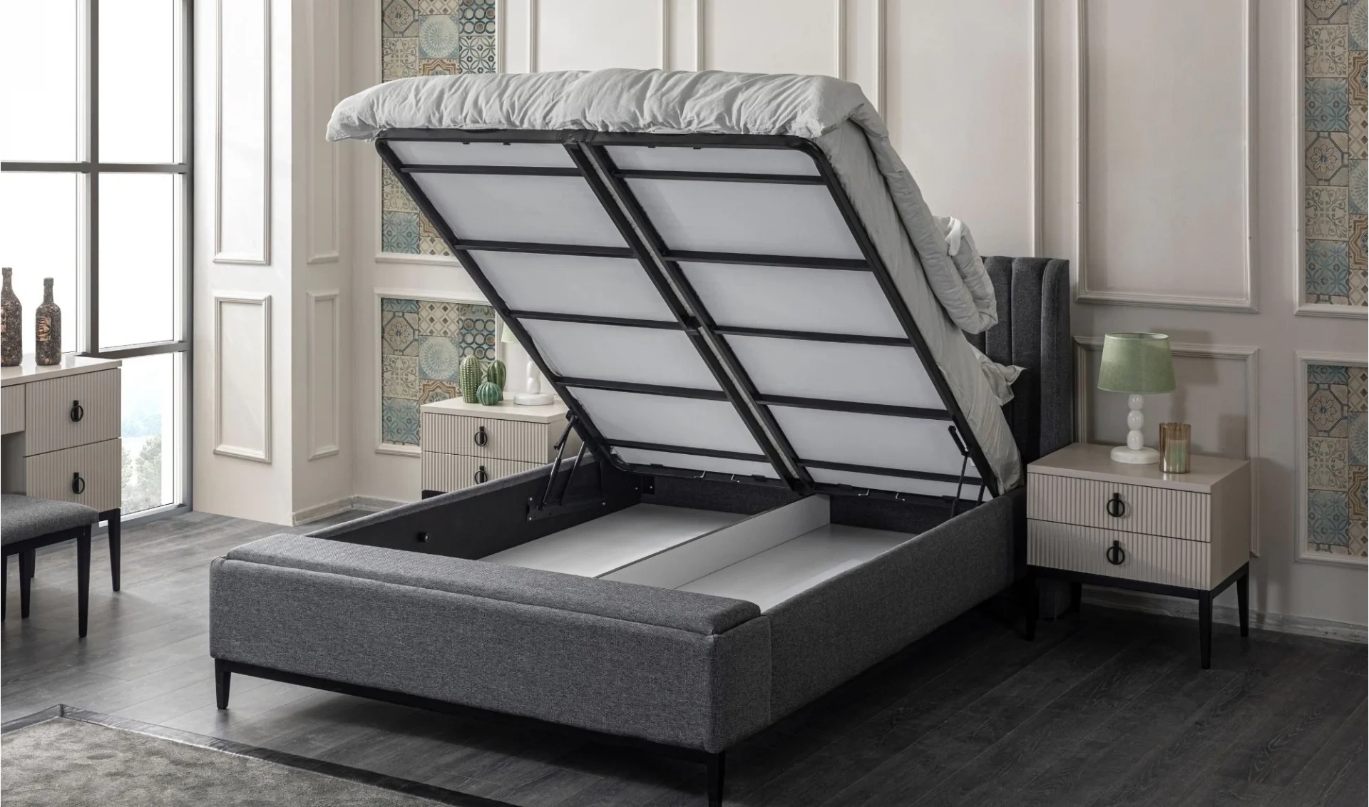 | Karyola | Bazalı (160x200 cm) , Bazalı (180x200 cm) , Bazasız (160x200 cm) , Bazasız (180x200 cm) , Bençli , Bençsiz |