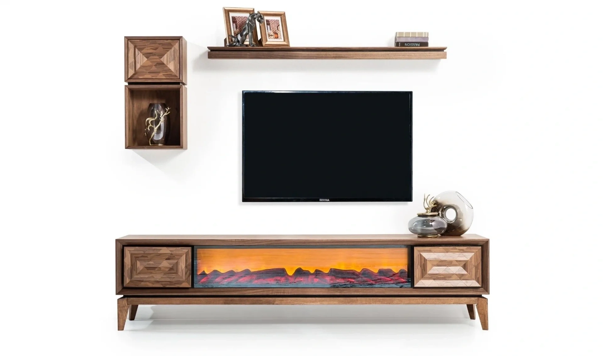 | Takım İçeriği | 1 ad. Tv ünitesi şömineli alt modül + 1 ad. Tv ünitesi üst blok + 1 ad. Tv ünitesi üst raf |