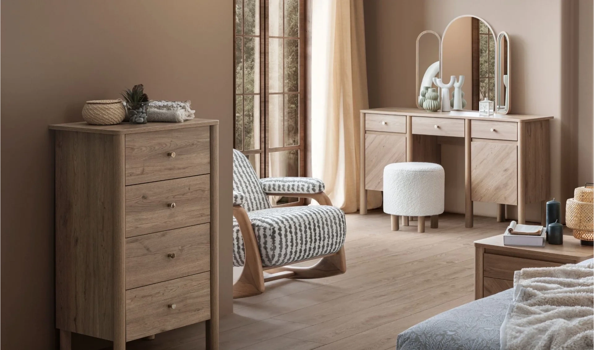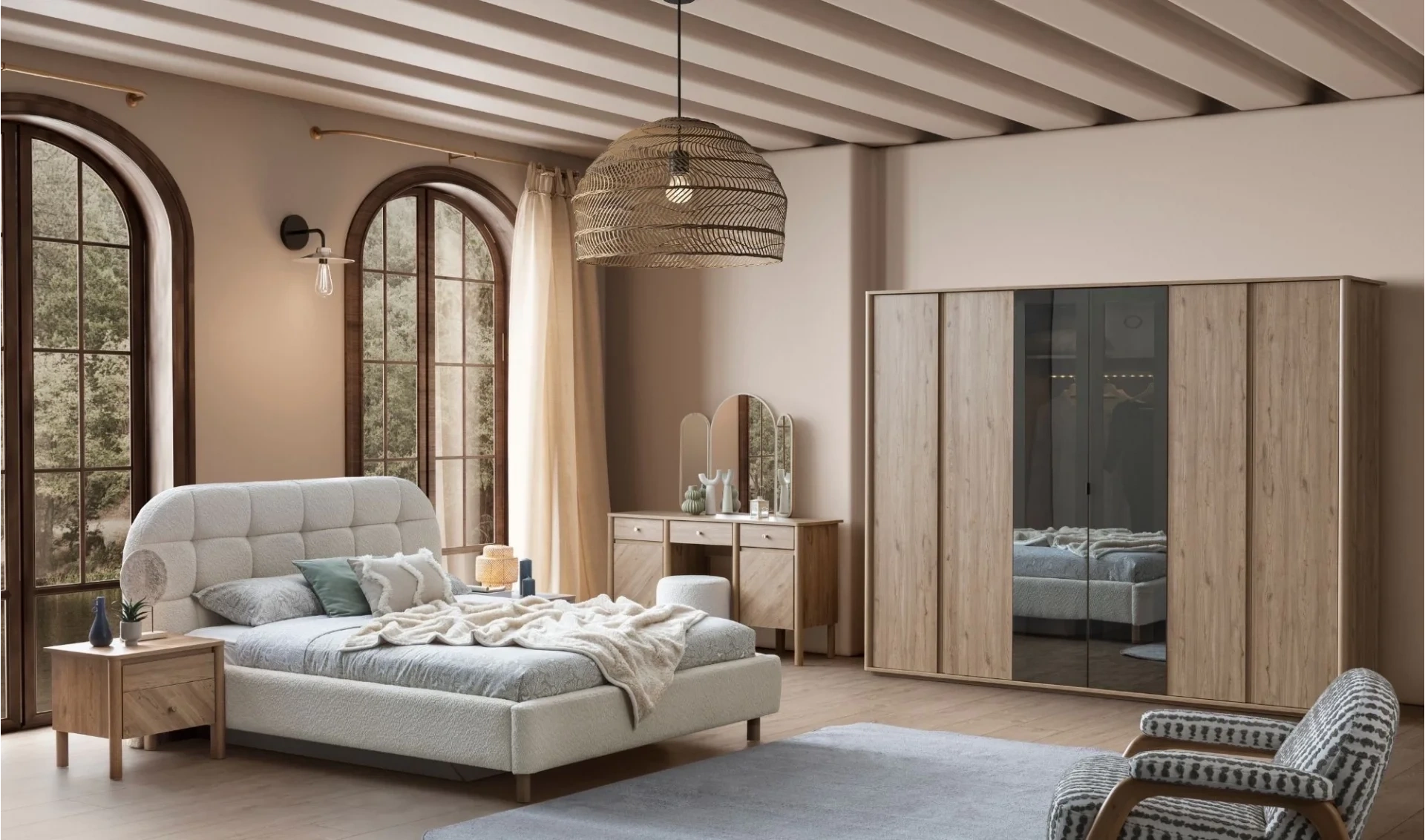 | Takım İçeriği | 6 Kapaklı gardrop + Bazalı karyola (160x200) + 2 ad. Komodin + Şifonyer ve ayna |