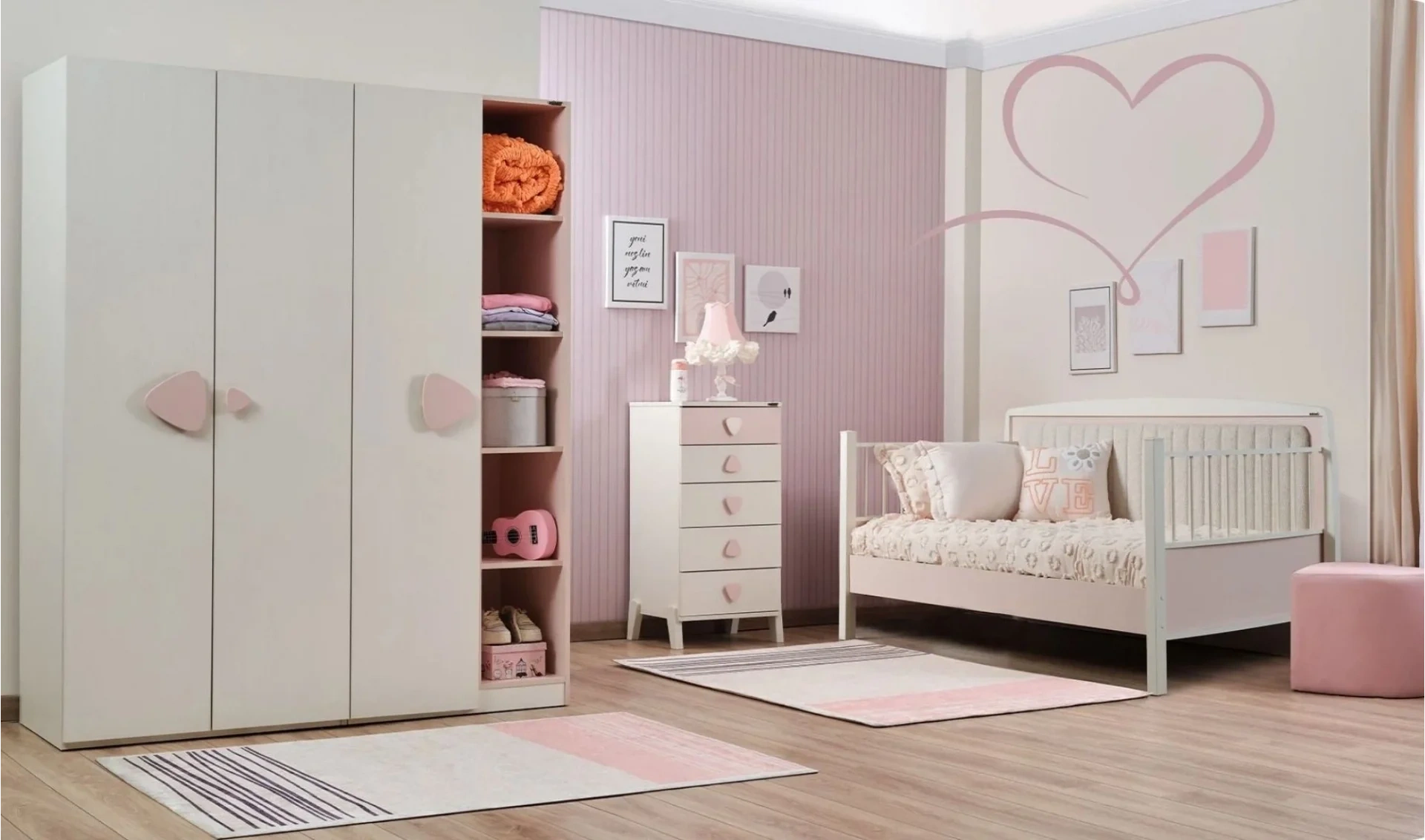 | Takım İçeriği | 2 Kapaklı gardrop + Nora montesorri (90x190 cm) + Yüksek şifonyer |