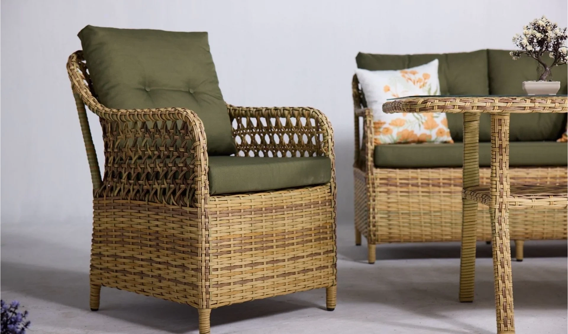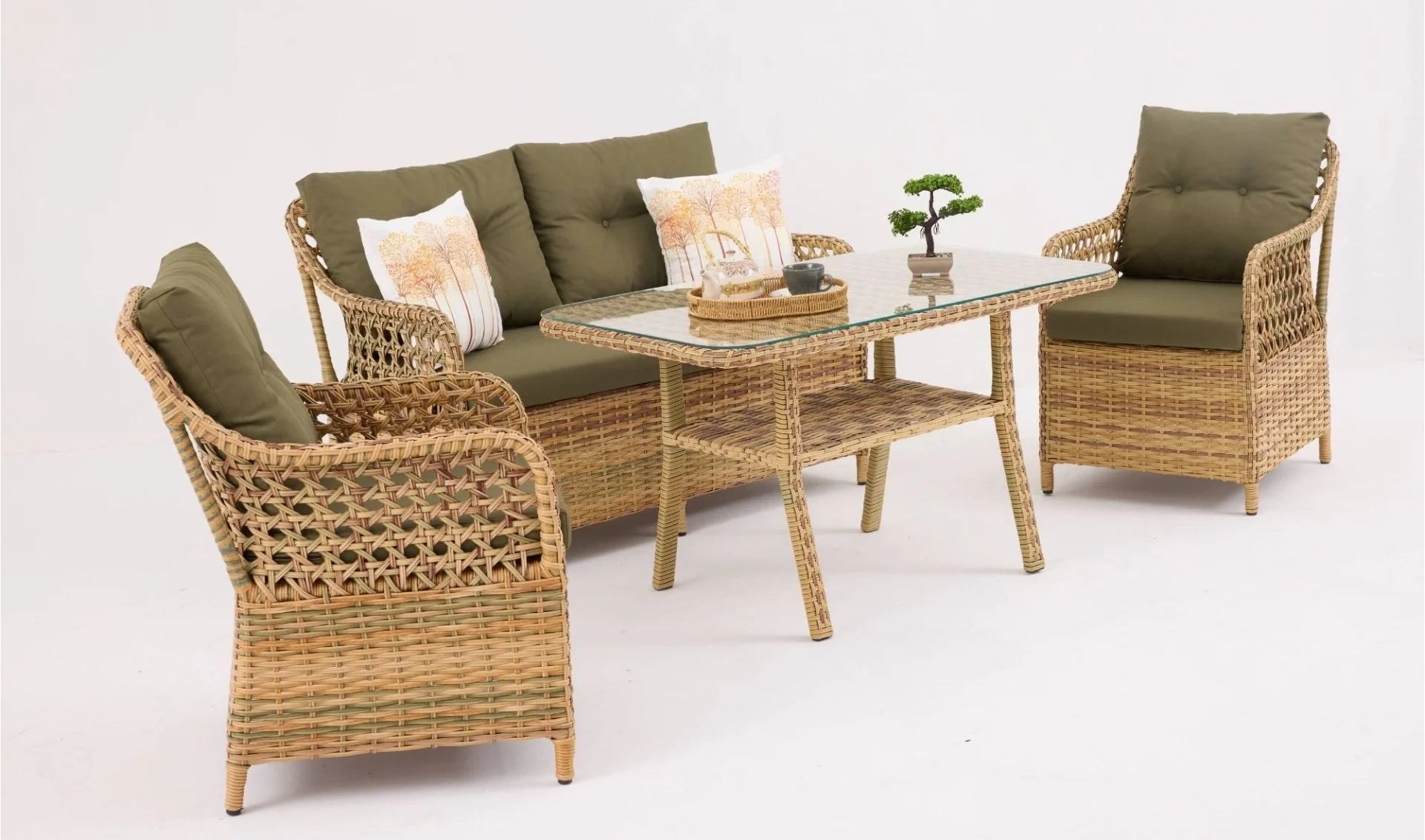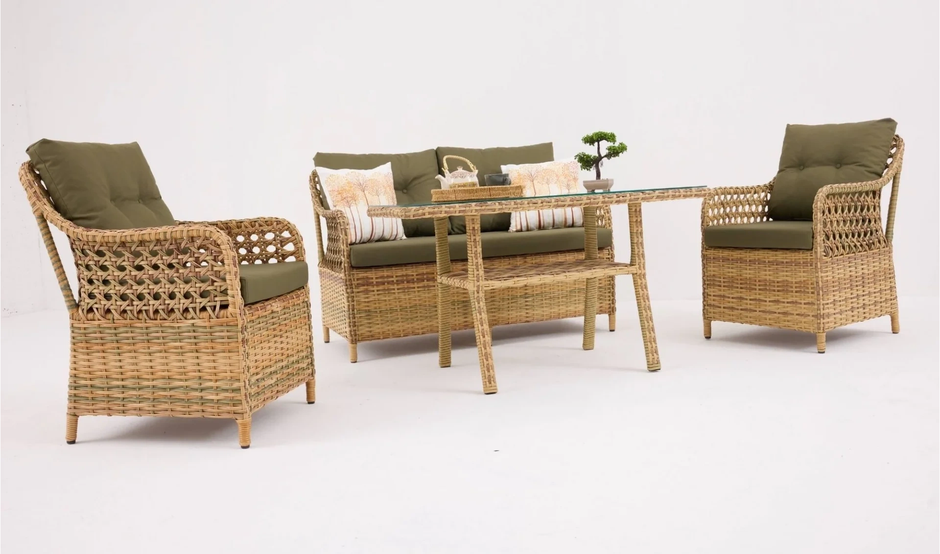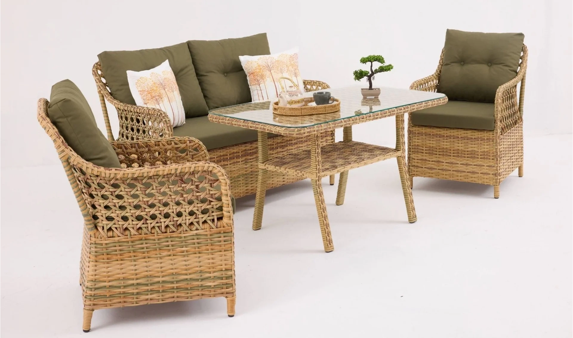 Rattan detaylarıyla dikkat çeken Sofya Elvan Çay Seti, dostlarınızla geçireceğiniz keyifli çay saatlerini daha özel kılar. Çay ikramlarınızı kolaylaştırırken rahat minderli sandalyeler konforu ön planda tutar. Bahçe ve balkonlarda hem estetik hem de kullanışlı bir seçenek olarak öne çıkar.